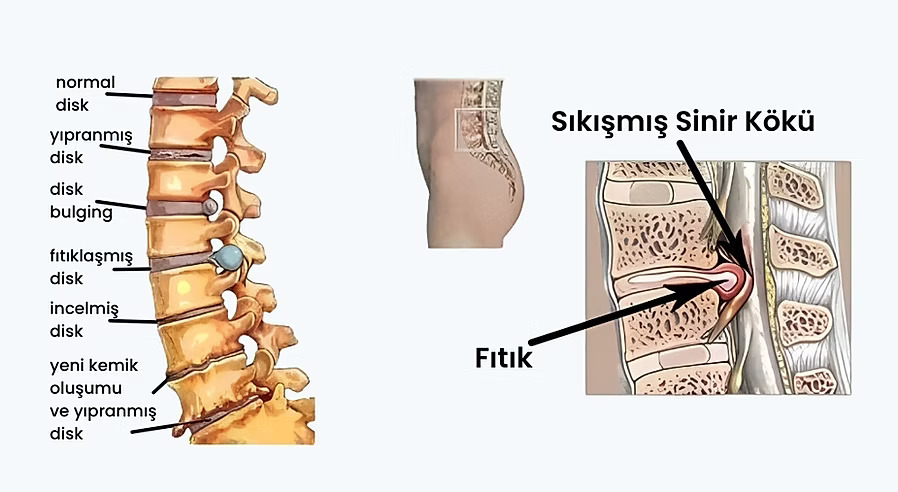 Bel Fıtığı Nedir? (Lomber Disk Hernisi)Tıbbi ismi Lomber Disk Hernisi olan bel fıtığı, sinirlerin disk kayması veya yırtılması sonucu omurlar arasında sıkışmasıdır.Omurgamızda her omurun (vertebra) arasında diskler vardır. Bu diskler omurlar arasında bir çeşit amortisör işlevi görür. Omurganın bel kısmı 5 adet lomber omurdan ve her biri arasındaki disklerden oluşur. Vücudumuzun temel ağırlığını en çok bu bölge taşır.Lomber bölge denilen bel bölgemizdeki bu disklerin zorlanma, düşme, ağır yük kaldırma gibi birçok farklı sebeplerden oluşabilen kayma veya yırtılması sonucu omurilik sinirleri omurlarımız arasından çıkabilir. Böyle bir durumda omurlar arasında sıkışan sinirler sadece bel bölgesinde değil, kalça ve bacak bölgelerine de varan dayanılmaz ağrılara sebep olur.